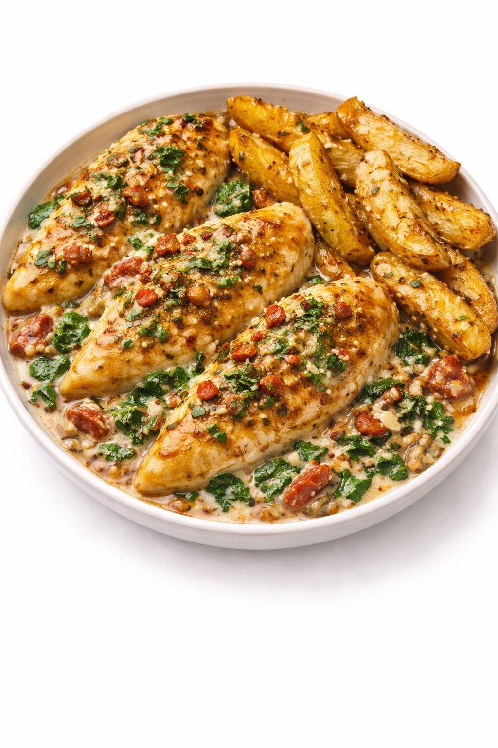 Creamy Tuscan Chicken loaded with Sundried Tomato , Spinach and oven baked potato Wedges