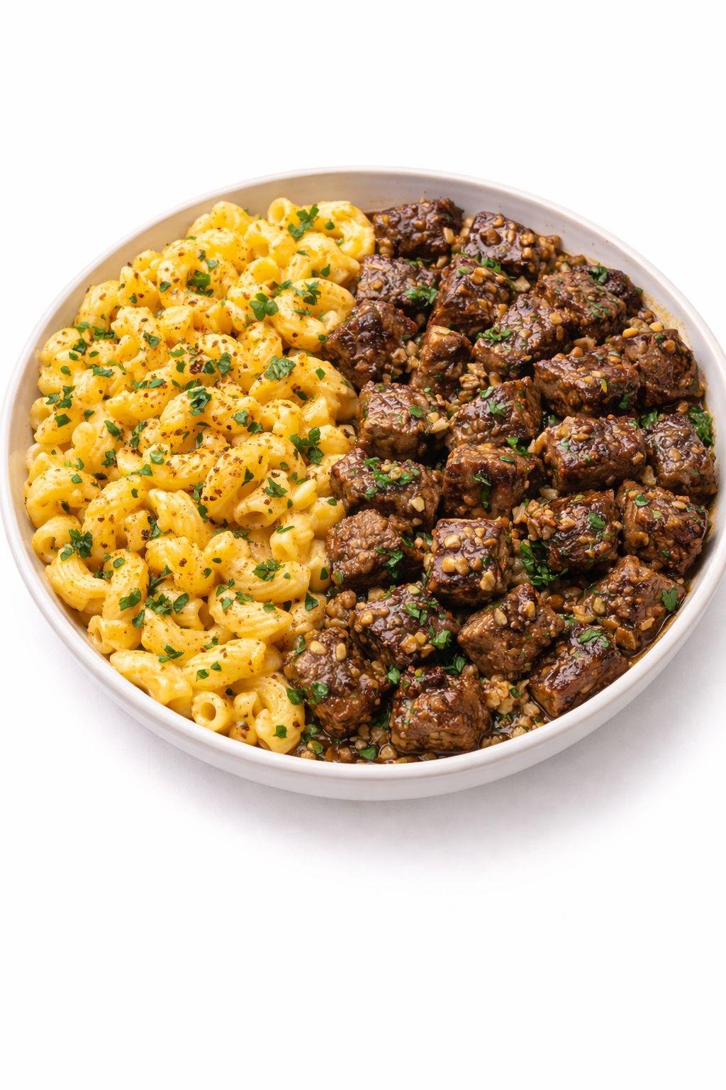 - Garlic Butter Beef Steak Bites with Cajun Mac & cheese