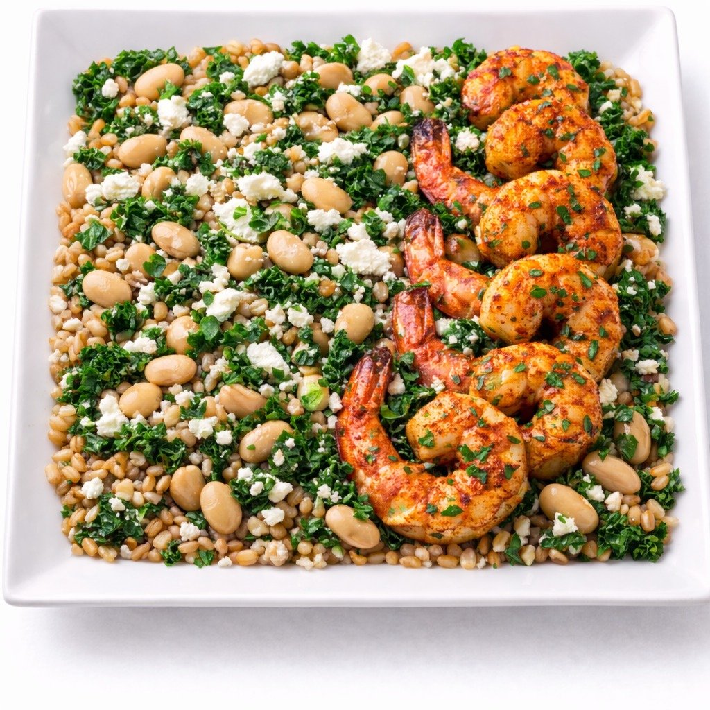 - Spiced Shrimp and Farro Bowl with cannellini Beans Feta and Kale