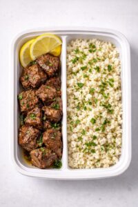 Savory Beef Steak Bites Tossed in Garlic Butter, Served Alongside Cauliflower Rice