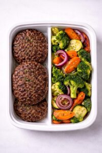 Homestyle Beef Patties Served with a Medley of Roasted Seasonal Vegetables