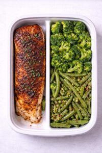 Perfectly Seasoned Blackened Cod Fish Served with Steamed Broccoli and Crispy Green Beans