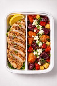 Juicy Grilled Chicken Served with Roasted Sweet Potatoes, Beets and Apple Finished with Creamy Goat Cheese