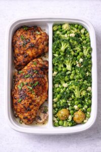 - Cajun Style Grilled Chicken Thighs Served with Broccoli and Green Peas Salad