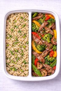 - Sizzling Garden Beef Stir-Fry Infused on Herbs Infused Brown Rice