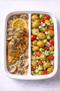 Oven Baked Greek Lemon Chicken Breast with Mushroom Sauce and Baby Potatoes Salad